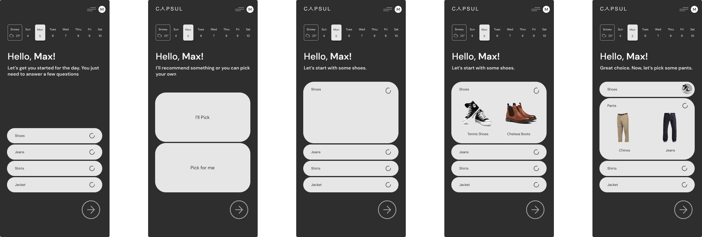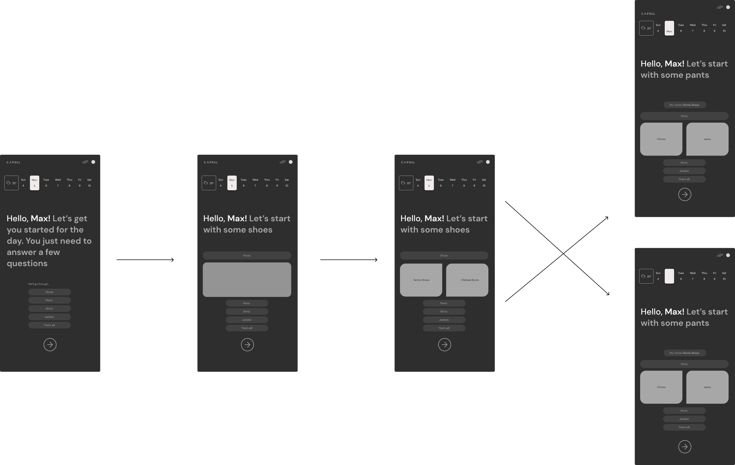 After the approval of Design B from the previous wireframes, I was able to build out the entire design and all possible outfits for the outfit generator in preparation for investor presentations.