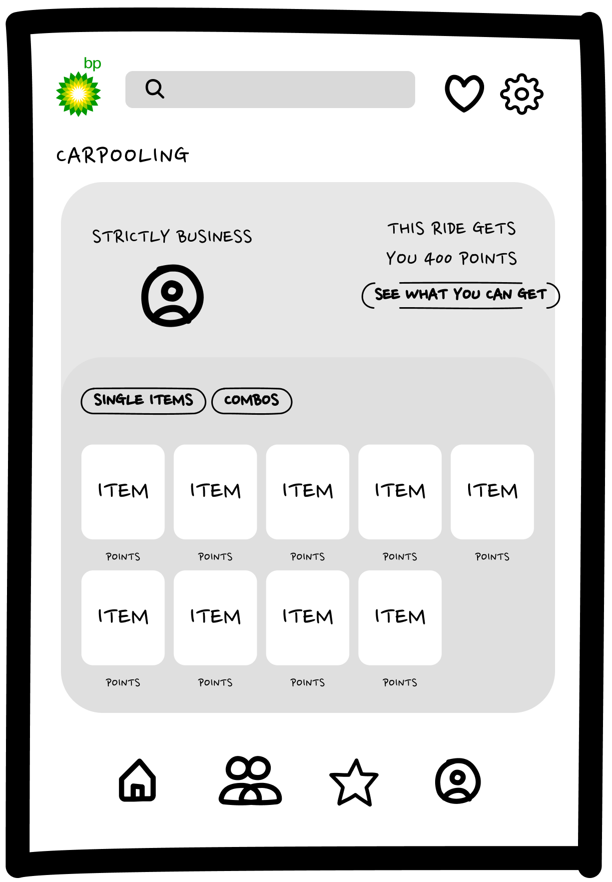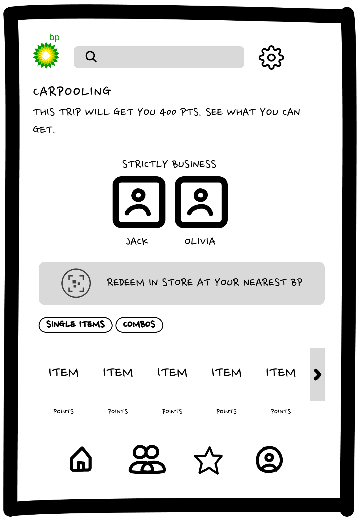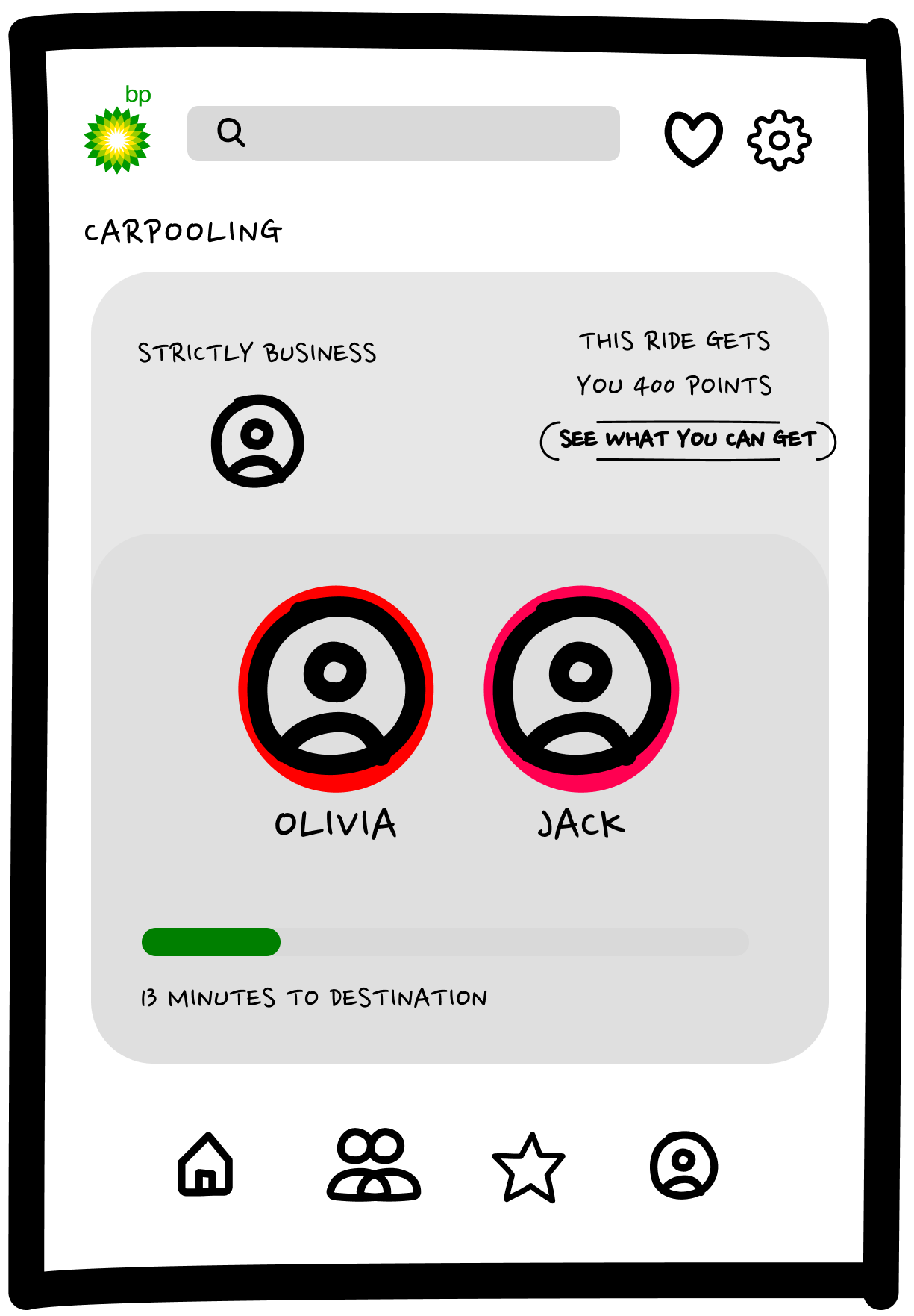 Users are encouraged to carpool to BP and really anywhere! Because of BP’s commitment to sustainability, this solution focuses on rewarding people for carpooling while making an interactive and fun experience while they are actively together and ultimately ends with leading people into the store.