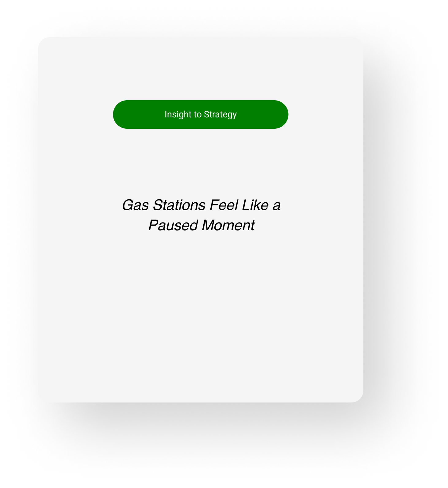 Due to the insight of gas stations being aligned to a paused moment, we thought it presented the perfect opportunity and strategic angle to present BP as a place that provides a refreshing moment to your day. From that, this strategic set up presents the opportunity to inspire positive association and brand loyalty. Through a value driven communications strategy that invests in building a distinct association between BP and refreshment.
